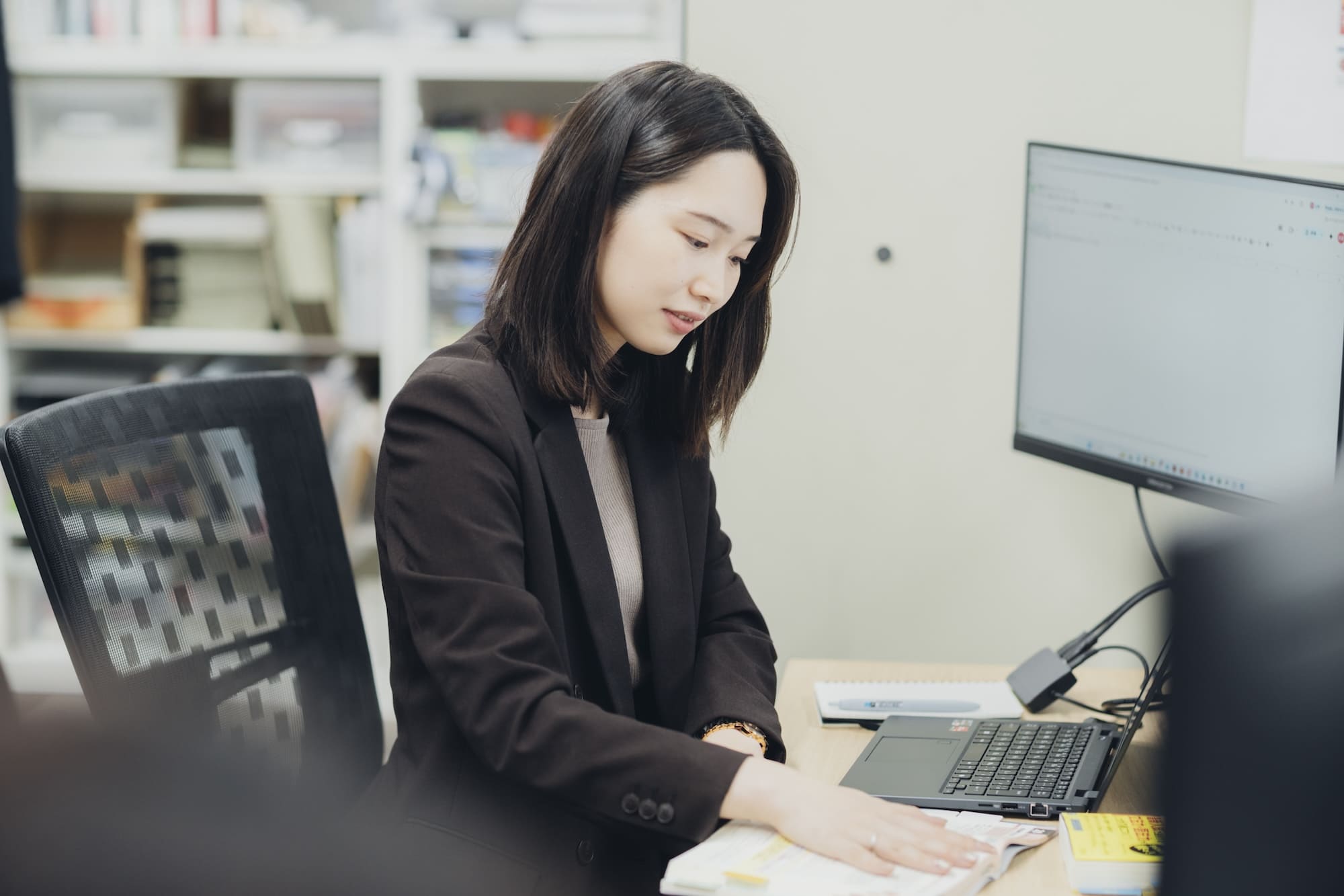 - 営業企画促進グループは書店営業と学校営業に分かれています。わたしは学校営業を担当していて、学校採用を目指す書籍やICTサービスについて学校の先生にヒアリング調査をして、そこから「どういう商品なら学校現場で役に立つのか」を営業の視点から考えて編集部と相談し、どんな言葉で商品の良さを紹介すれば採用につながるのかを考えるのがメインの業務です。営業トークを組み立てたり、商品を紹介するチラシや採用校の活用事例集をつくったり、私の業務はとにかく「言葉」と向き合うこと。先生のお話を伺って、困りごとや解決方法を言語化し、商品や売り方に落とし込んでいくイメージです。